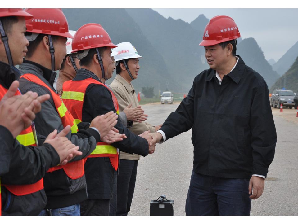 11月22日至23日,自治區(qū)交通運輸廳廳長潘巍、副廳長梁毅分別蒞臨廣西路建公司靖那路、欽崇路、玉鐵路等項目檢查調(diào)研,了解項目旱季施工情況,親切慰問奮戰(zhàn)在施工一線的廣大員工,要求各項目把握好有利時機,堅決打贏旱季攻堅戰(zhàn),以優(yōu)異的成績促進交通建設(shè)發(fā)展。