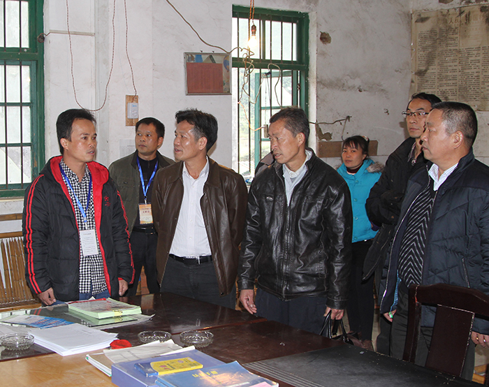 集團公司朱堅和董事長(左三)、張友坐副書記(右一)聽取駐村”第一書記“梁義寬匯報工作。 在相堯村、豹山村、才帛村,朱堅和董事長分別與當地鎮、村干部以及覃獻康、梁義寬、蔣博三位派駐農村“第一書記”和扶貧工作隊隊員進行親切交談,詳細詢問“第一書記”工作、生活情況,并聽取了“第一書記”關于幫扶村的黨建及村集體經濟發展情況匯報。得知目前各駐村書記及扶貧工作隊員已經完成精準扶貧入戶摸底調查時,朱堅和董事長對“第一書記”到村以來,深入調查走訪,積極幫助村里理思路、定規劃、辦實事,表示充分肯定。