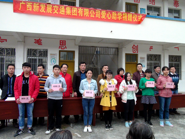 當(dāng)日,集團(tuán)公司在豹山村舉行愛(ài)心助學(xué)捐贈(zèng)儀式,掛牌成立了廣西新發(fā)展交通集團(tuán)愛(ài)心助學(xué)基金會(huì),向扶貧聯(lián)系點(diǎn)200多名貧困學(xué)子捐資助學(xué)獻(xiàn)愛(ài)心。劉明洪副總經(jīng)理殷切希望貧困學(xué)子們努力學(xué)習(xí),常懷感恩之心,學(xué)好本領(lǐng),將來(lái)回報(bào)家鄉(xiāng)、回報(bào)社會(huì)。