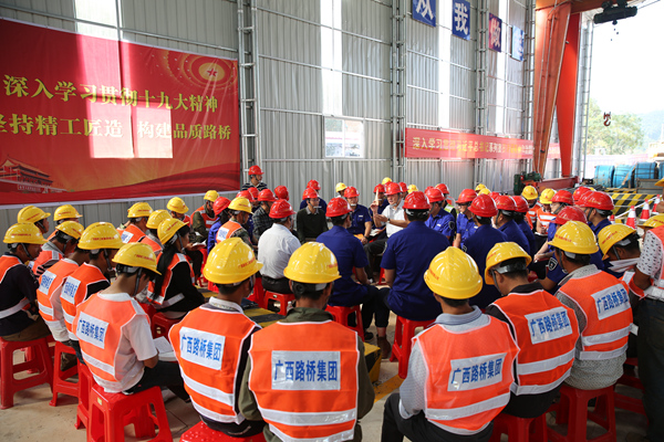 11月3日,自治區人大常委會副主任、總工會主席王躍飛來到集團公司基層項目廣西路橋集團柳南高改快3標宣講黨的十九大會議精神。自治區總工會黨組書記、副主席侯線紅,自治區總工會巡視員陳湘文,自治區直屬企事業工會常務副主任馬寧,集團公司黨委副書記、工會主席張友坐,廣西路橋集團黨委副書記、副董事長、工會主席曹文海等隨同。