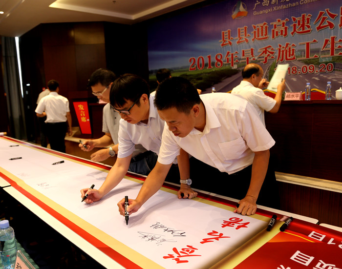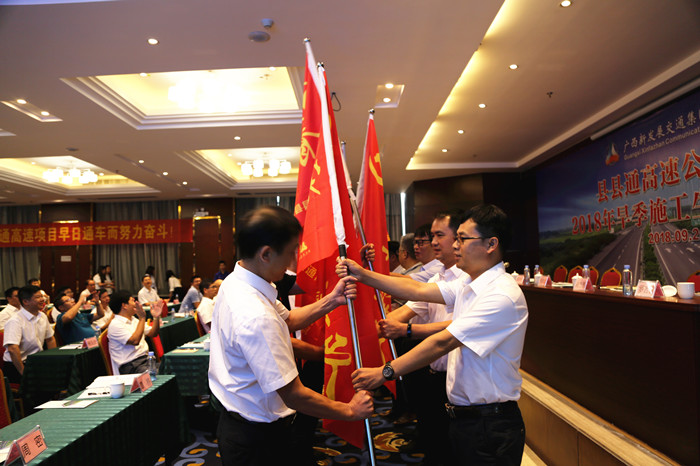 會(huì)上,與會(huì)領(lǐng)導(dǎo)為各參建單位代表授“黨員先鋒隊(duì)”及“青年突擊隊(duì)”旗子。會(huì)上還開展了旱季施工質(zhì)量安全承諾簽字活動(dòng)。