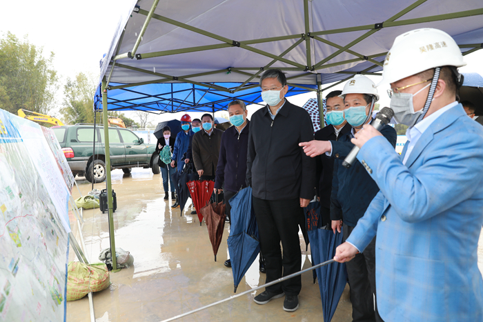 自治區(qū)副主席費(fèi)志榮(右四)到吳隆路施工現(xiàn)場(chǎng)調(diào)研交通項(xiàng)目復(fù)工建設(shè)情況