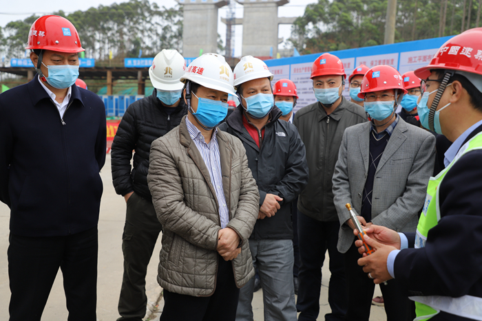 3月5日,自治區(qū)交通運輸廳副廳長王劼耘到大塘至浦北高速公路項目開展防疫及復(fù)工復(fù)產(chǎn)工作情況調(diào)研。自治區(qū)交通工程質(zhì)量安全監(jiān)督站站長陳津維、自治區(qū)高速公路發(fā)展中心主任周北、欽州市政府副秘書長黃立和一同調(diào)研。